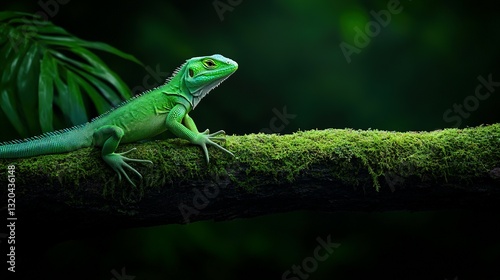 lizzard, green, reptile, animal, nature, tree branch, moss, forest, wildlife, scale, eye, head, tail, claw, leg, skin, pattern, texture, jungle, tropical, environment, colours, bright, closeup, detail, natural, wild, pose, surface, foliage, tree, view, life, vibrant, calm, beauty, scenic, sharpened, light, background, macro, serene, delicate, habitat, outdoors, sunny, perspective