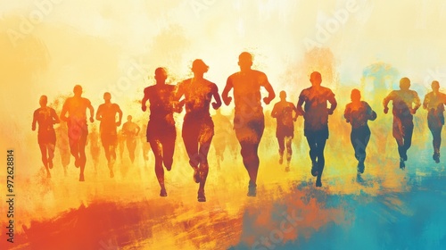 runner, race, community, sunset, trail, fitness, exercise, movement, people, athletic, warm colors, crowd, marathon, health, lifestyle, competition, determination, speed, silhouette, road, teamwork, energy, sport, activity, nature, vibrant, leisure, challenge, endurance, celebration, enthusiasm, vitality, athleticism, oneness, recreational, landscape, dusk