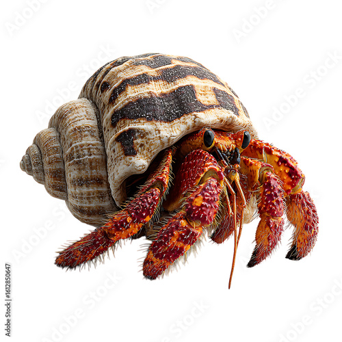 A vibrant hermit crab with orange legs and claws, nestled in a patterned shell, isolated on white on transparent background