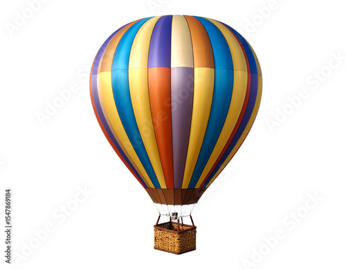 A vibrant hot air balloon, with colorful stripes, floating gracefully, basket attached. PNG