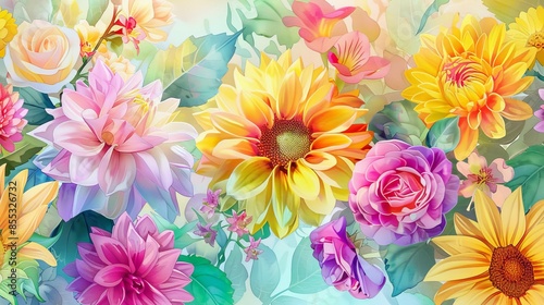 A vibrant illustration depicting a bouquet of sunflowers, roses, and dahlias in full bloom, with a soft pastel background