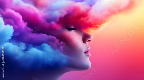A vibrant illustration depicting a serene face enveloped by colorful clouds, representing dreams and creativity.