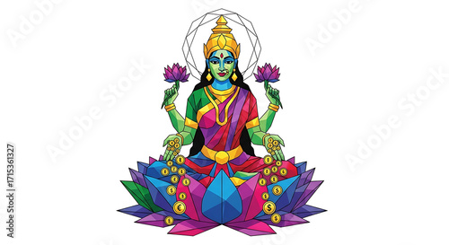 deity, hindu, goddess, religion, spirituality, culture, tradition, worship, faith, devotion, illustration, vector, art, design, graphic, colourful, vibrant, lotus, flower, blossom, flower petals, blue, green, gold, red, purple, ornament, jewellery, crown, halo, circle, light, radiance, divine, grace, peace, calm, meditation, pose, seated, arm, hand, holding, offering, blessing, prosperity, wealth, abundance