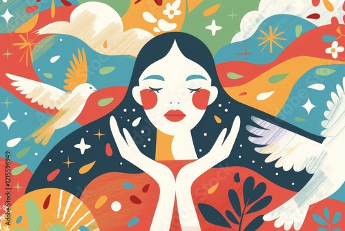A vibrant illustration of a woman with flowing hair surrounded by nature, birds, and abstract shapes.