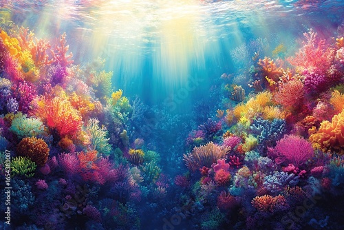 A vibrant illustration of an underwater coral reef teeming with marine life, but with no animals present.