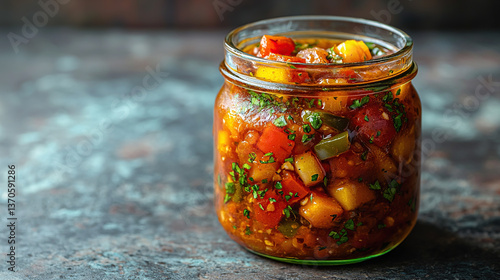A vibrant jar of homemade ratatouille, showcasing fresh garden vegetables and aromatic herbs.