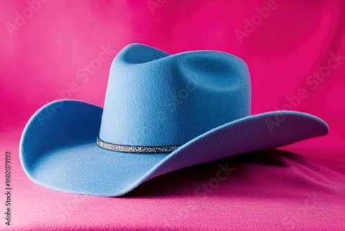 A vibrant, light-blue cowboy hat sits on a hot pink backdrop.