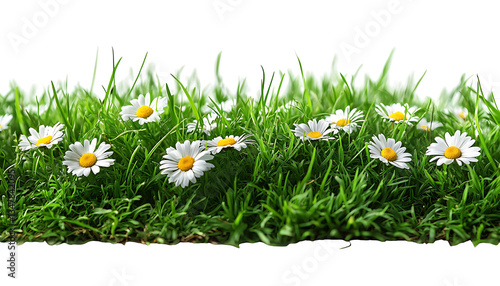 A vibrant, lush strip of green grass with tiny white and yellow daisy flowers growing naturally.