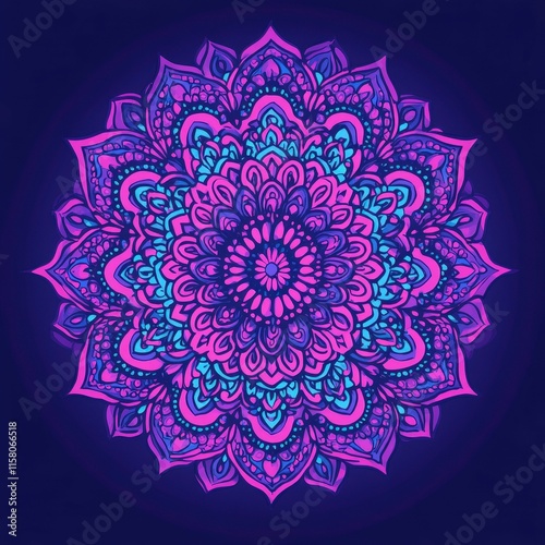 A vibrant mandala design featuring intricate patterns in shades of pink and blue, set against a dark background, often used for relaxation, meditation, or artistic decoration.
