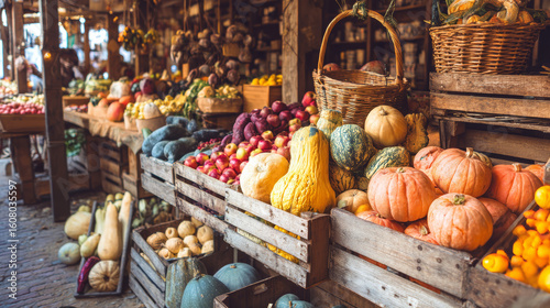 A vibrant market scene filled with various fresh fruits and vegetables. Wooden crates display colorful produce like pumpkins, squash, and apples. Natural lighting enhances the atmosphere.
