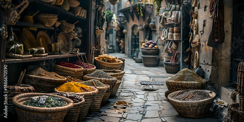 A Vibrant Marketplace Alley Lined with Baskets of Colorful Spices and Herbs, Surrounded by Rustic Shop Displays and Ambient Lighting