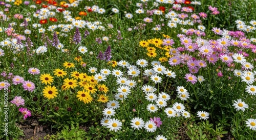 A Vibrant Meadow Bursting with Colorful Springtime Daisy-Like Flowers in Full Bloom
