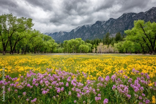 A vibrant meadow bursts with wildflowers, punctuated by vibrant green trees, under a dramatic sky of gray clouds, with snow-capped mountains in the distance