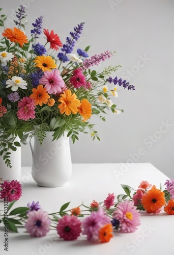 A vibrant mix of spring flowers and foliage on a minimalist white table , garden background, spring decor