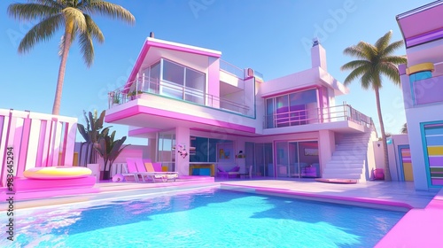A vibrant, modern house with a pool, surrounded by palm trees in a sunny environment.