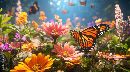 A vibrant monarch butterfly gracefully landing on a colorful flower meadow