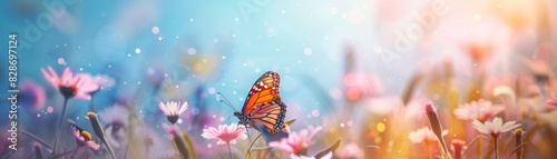 A vibrant monarch butterfly perched on a flower, set against a dreamy, colorful background. Perfect for spring themes and nature concepts.