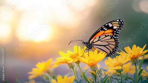 A vibrant monarch butterfly perched on bright yellow flowers, set against a soft, glowing background of sunlight.