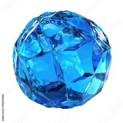 A vibrant, multifaceted, blue sphere. Detailed facets create a textured, glassy effect