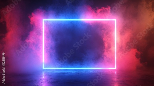 A vibrant neon frame stands out amidst colorful smoke in a moody scene.
