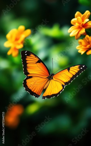 butterfly, flower, orange, nature, beauty, serenity, wing, rich, harmony, high-coloured, lush, wilderness, tranquil, vibrant, photo, flight, elegance, wildlife, growth, alive, ecosystem, sunlight, fauna, scene, insect, flower petals, enchantment, species, blossom, winged, richness, charming, attraction, freshness, nectar, delicacy, macro, colourful, flora, green, environment, spring, natural, bloom, summer, garden, landscape