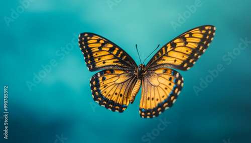A vibrant orange butterfly gracefully flutters against a soft blue background, showcasing nature's beauty and delicacy.