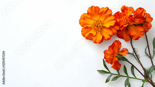 A vibrant orange marigold with open petals, empty space for text, isolated on the white background