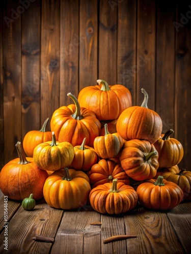 A vibrant orange pumpkin pile with various shapes and sizes scattered on a rustic wooden table