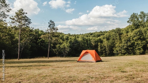 tent, field, nature, vibrant, orange, set, serene, grassy, surround, lush, green, tour tourism, live, summer, scenic, travel, journey, leisure, colours, hike, light, backpack, backyard, park, earth, expanse, landscape, cloud, sunshine