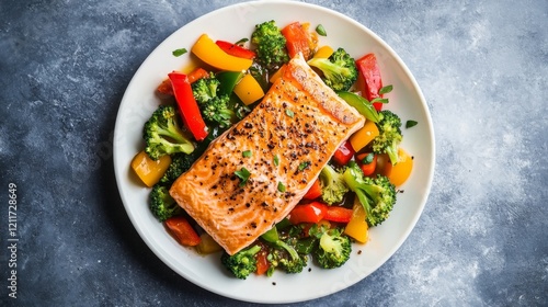 A vibrant overhead shot of a salmon and vegetable stir-fry, showcasing colorful bell peppers, broccoli, and tender salmon pieces in a delicious sauce