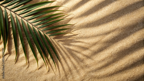 A vibrant palm leaf rests on warm sand, with its shadows stretching beautifully across the surface in the afternoon light