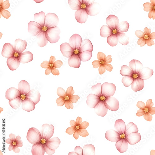 A vibrant pattern of pink and peach flowers scattered on a white background, creating a cheerful and fresh floral design.