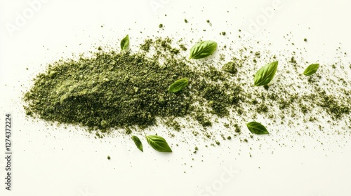 A vibrant pile of green herb powder scattered artistically with fresh leaves on a clean surface