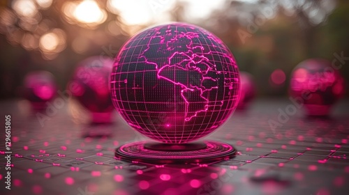 A vibrant pink globe resting on an elegant table surrounded by natural light and soft shadows