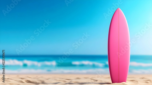 A vibrant pink surfboard stands on the sandy beach against a backdrop of waves and a clear blue sky.
