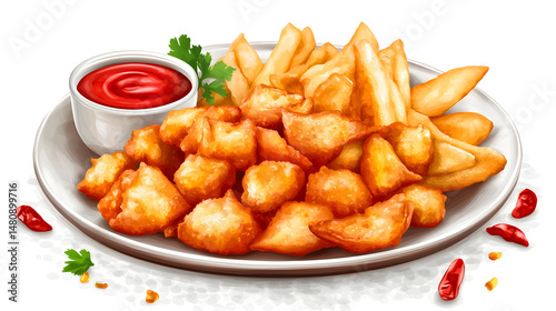 A vibrant plate of crispy fried chicken nuggets and golden French fries, served with a side of tangy ketchup.