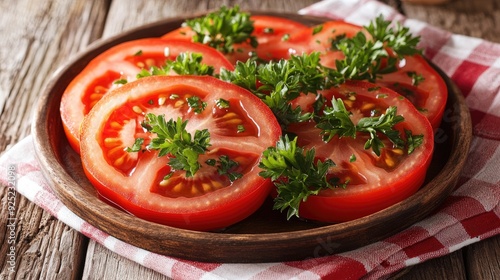 A vibrant plate of fresh tomato slices garnished with sprigs of parsley, set on a wooden table with a checkered napkin