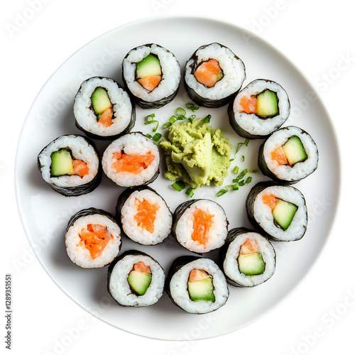 A Vibrant Plate of Sushi Rolls with Wasabi and Soy Isolated on Transparent Background