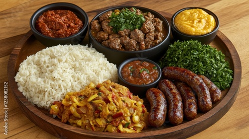 A Vibrant Platter of Hearty Traditional Cuisine Featuring Savory Meats, Fluffy Rice, and Colorful Sides Served on a Rustic Wooden Board