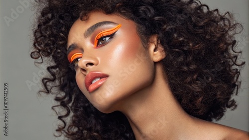 vibrant, person, fluorescent, orange, eyeliner, outline, eye, geometrical, adding, edgy, flair, model, dark, curly, hair, frame, face, expression, bold, confident, bright, portrait, contemporary, modern style, fashion, emotional, intense, creative, energy, trendy, artistic