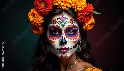A vibrant portrait of a woman with Dia de los Muertos makeup, adorned with a marigold flower crown, celebrating cultural traditions and artistry.