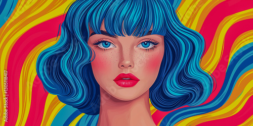 A vibrant portrait of a woman with striking blue hair, expressive eyes, and a bold colorful background, showcasing a retro and artistic flair.