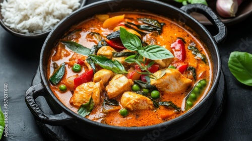 A vibrant pot of Thai curry with colorful vegetables and chicken, garnished with fresh herbs and served with a side of rice, highlighting the rich and spicy flavors.