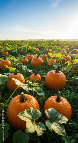 pumpkin, pumpkin patch, fall, autumn, harvest, field, morning, sunrise, landscape, orange, agriculture, crop, farm, nature, countryside, rural, vegetable, seasonal, ripe, growth, abundance, plant, leaf, vine, stem, sunlight, blue skies, outdoors, daytime, bright, colourful, farming, food, healthy