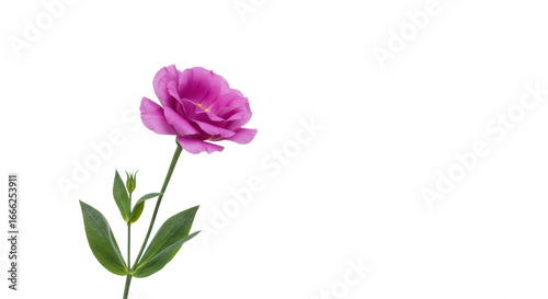 A vibrant purple-pink flower with delicate petals, slender green stem, and leaves, isolated on a transparent background with copy space for elegant natural beauty concept