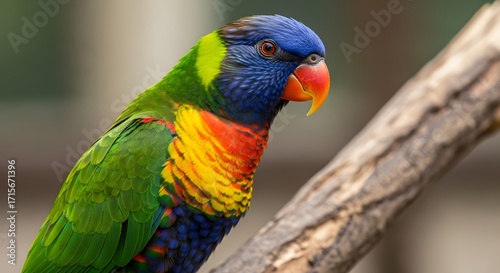 A vibrant Rainbow Lorikeet with a blue head and colorful plumage perched on a tree branch.