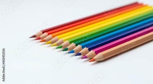 A vibrant rainbow of colored pencils arranged neatly on a white background, showcasing their bright hues and sharp points.