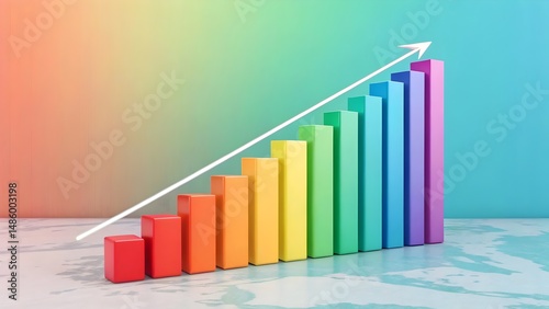 A vibrant rainbow-colored bar graph ascends sharply, showcasing upward growth. This polished 3D-style visual is set against a soft teal background, symbolizing progress and positive business trends.