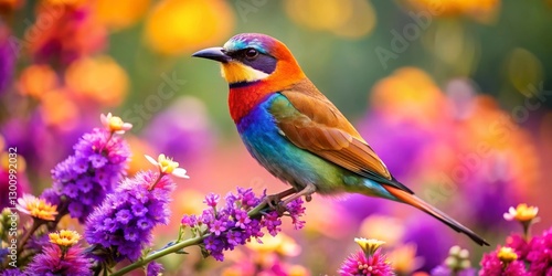 A Vibrant Rainbow-Colored Bird Perched Gracefully on a Branch Amidst a Lush Garden of Colorful Blossoms