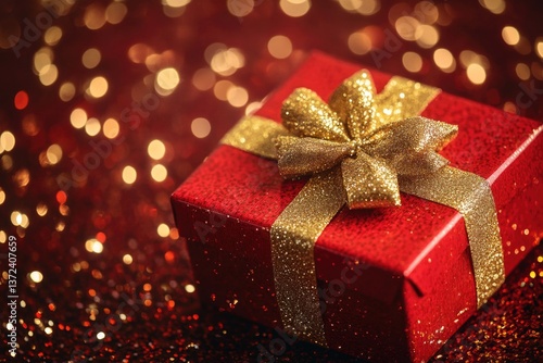 A vibrant red gift box adorned with a shimmering golden ribbon on top.